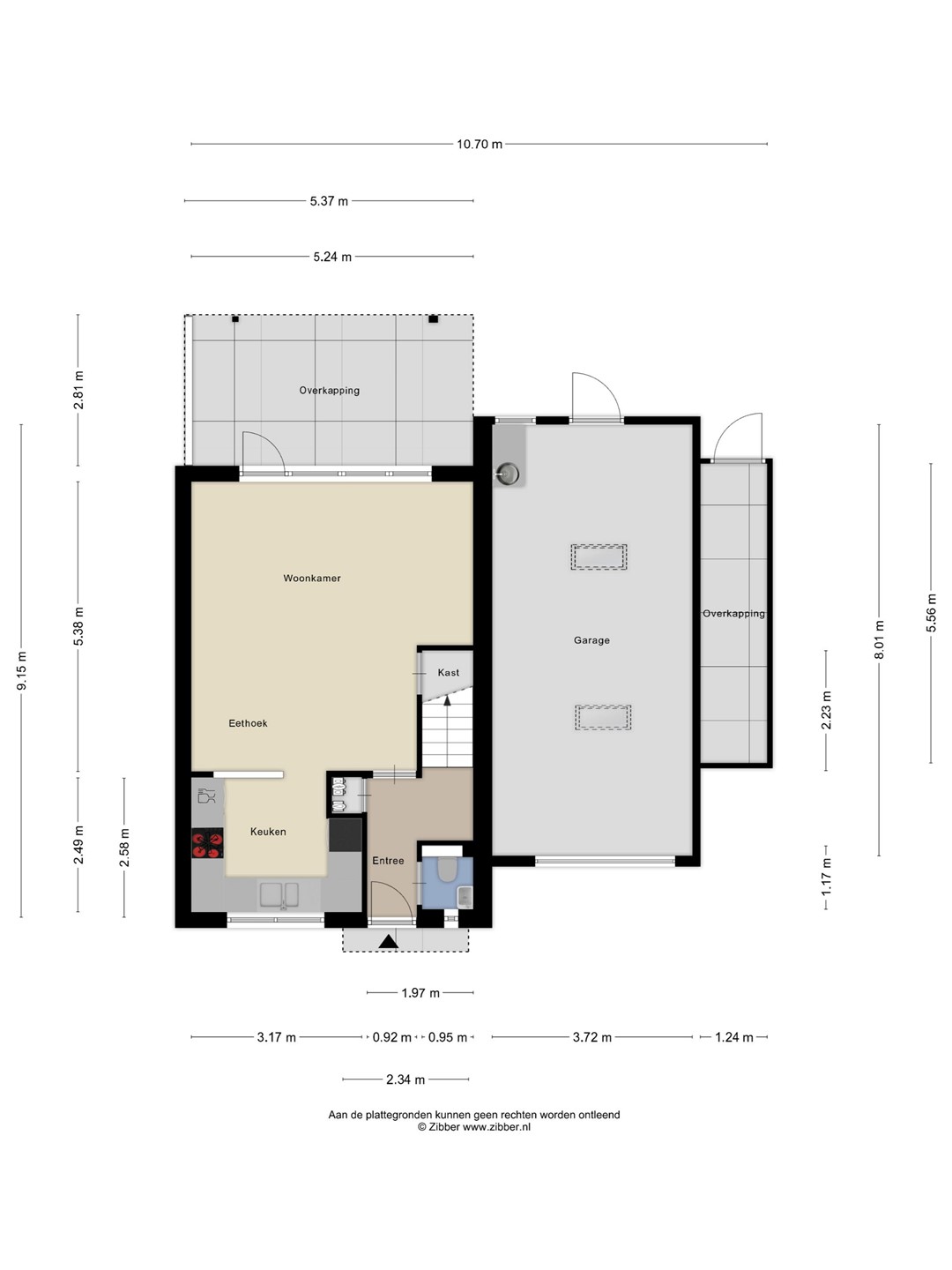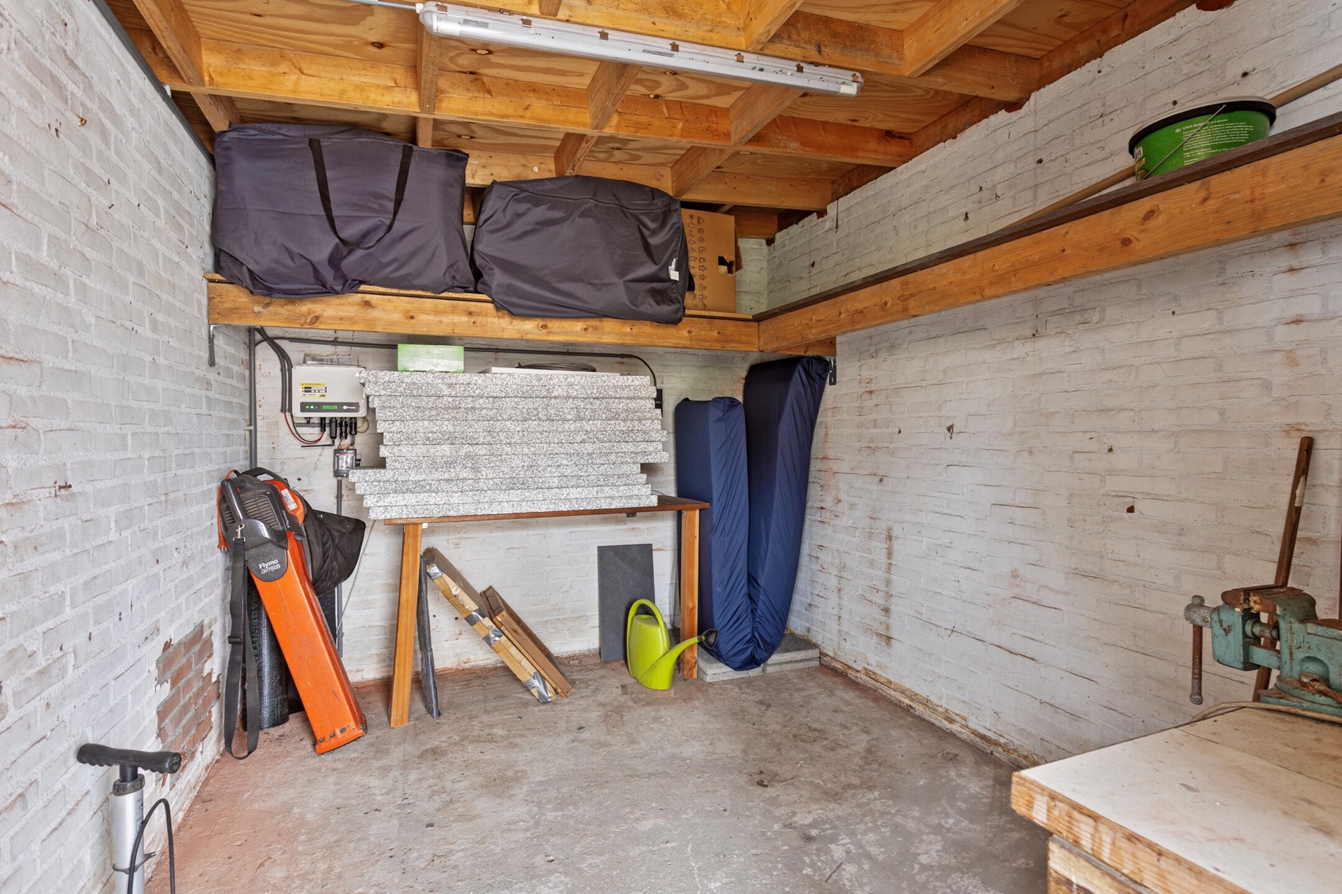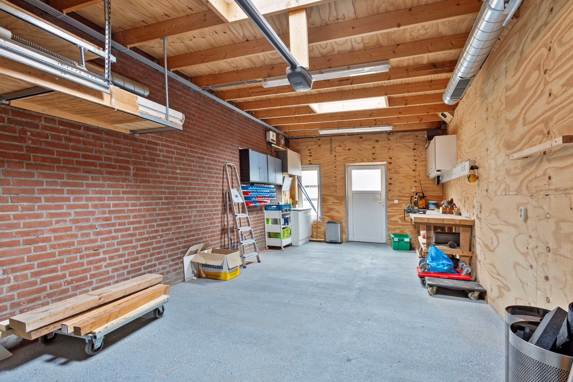 De voortuin is onderhoudsvriendelijk aangelegd met sierbestrating, een border en een oprit voor één auto. De ruime garage (circa 30 m²) is voorzien van een elektrische sectionaalpoort, twee dakkoepels, een achterdeur, gecoate betonvloer en een keukenblok met warm/koud water en elektriciteit.