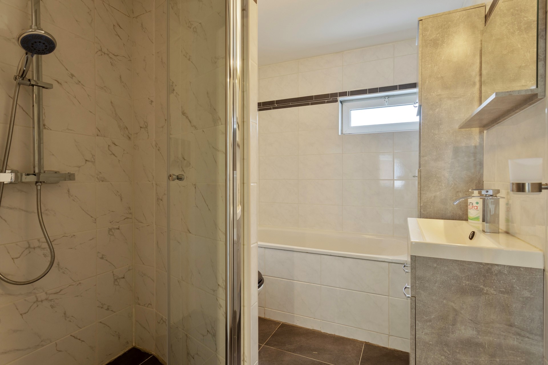 De overloop geeft toegang tot drie slaapkamers, alle van prettig formaat en voorzien van laminaatvloeren. De volledig betegelde badkamer is ingericht met een ligbad, aparte douchecabine, wastafel in meubel en toilet.