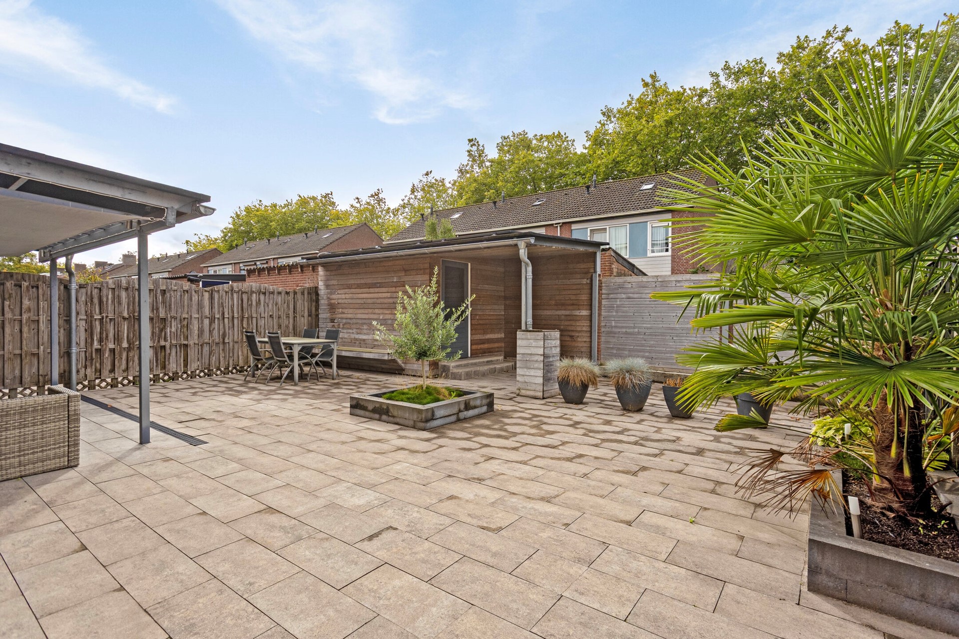 Direct achter de woning ligt een overkapping met terras. De achtertuin is volledig bestraat en voorzien van een border met beplanting en een houten schutting met betonpalen en dubbele deuren. Hierdoor heb jij de mogelijkheid om ook in de achtertuin een auto te parkeren. Achterin staat een stenen berging met houten afwerking, waarin tevens de omvormer van de zonnepanelen is geplaatst.