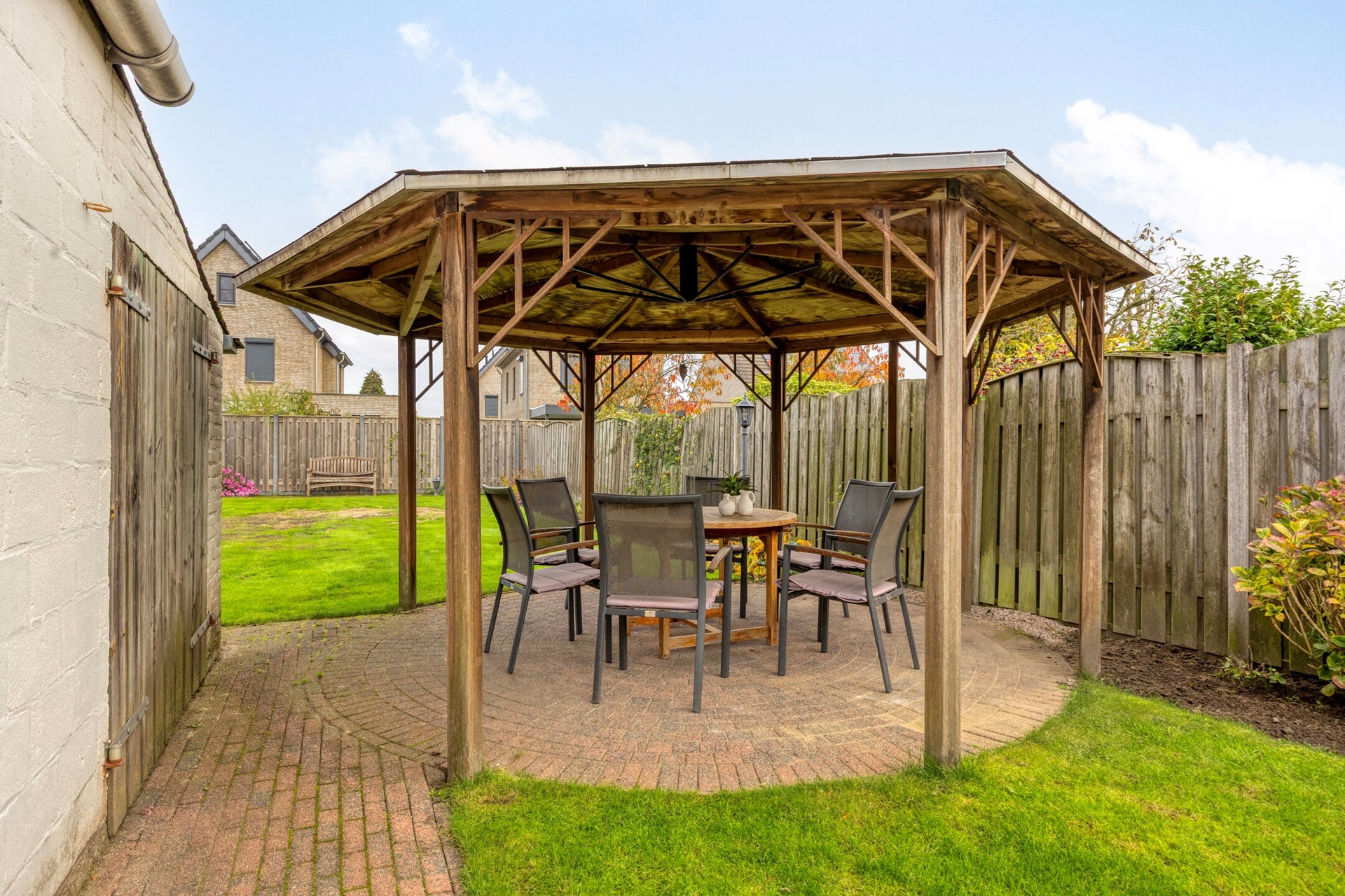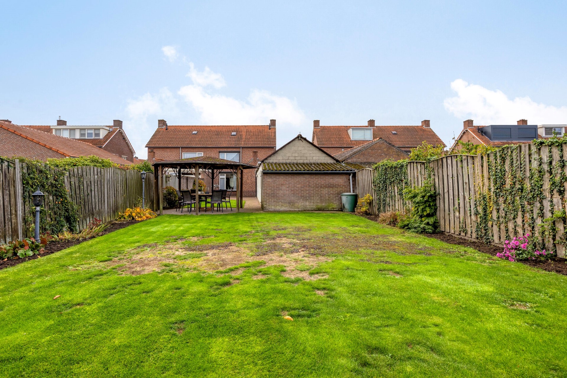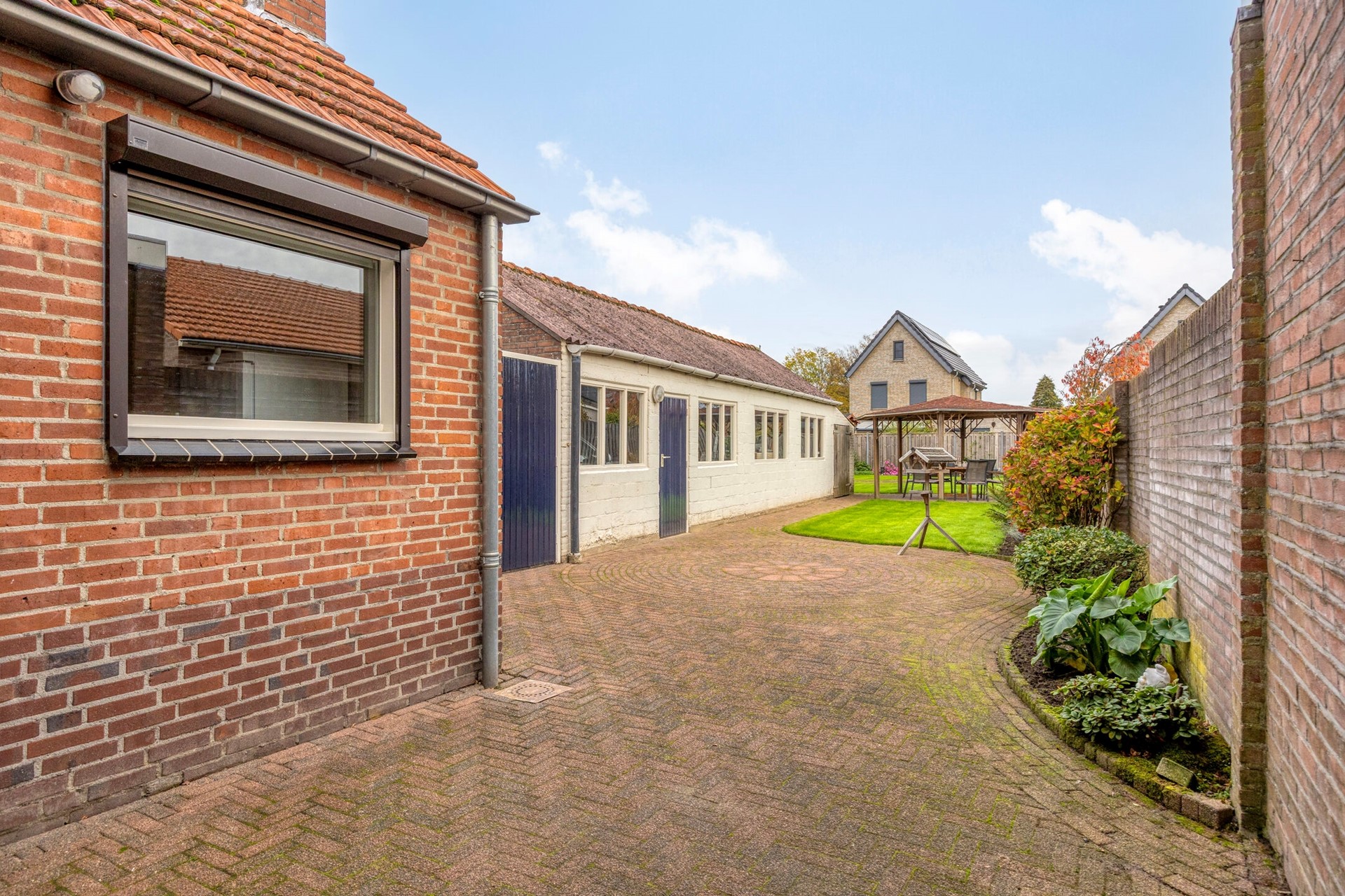 De woning heeft een royale voortuin met gazon en beplanting, en een ruime, beklinkerde oprit die plaats biedt aan meerdere auto’s. Via de poort kom je in de diepe achtertuin: keurig aangelegd met terras, gazon, borders, tuinverlichting en een sfeervol prieel.