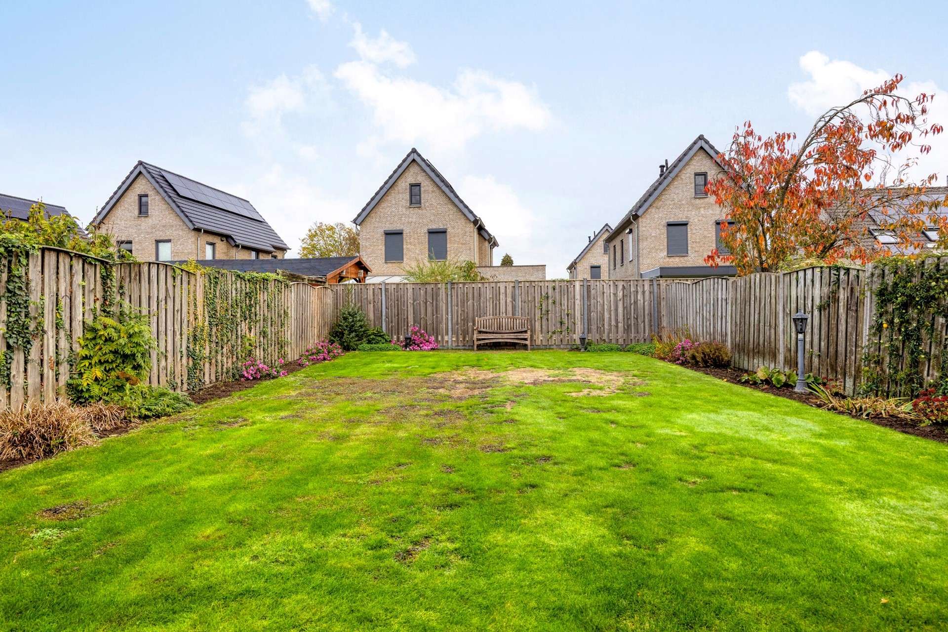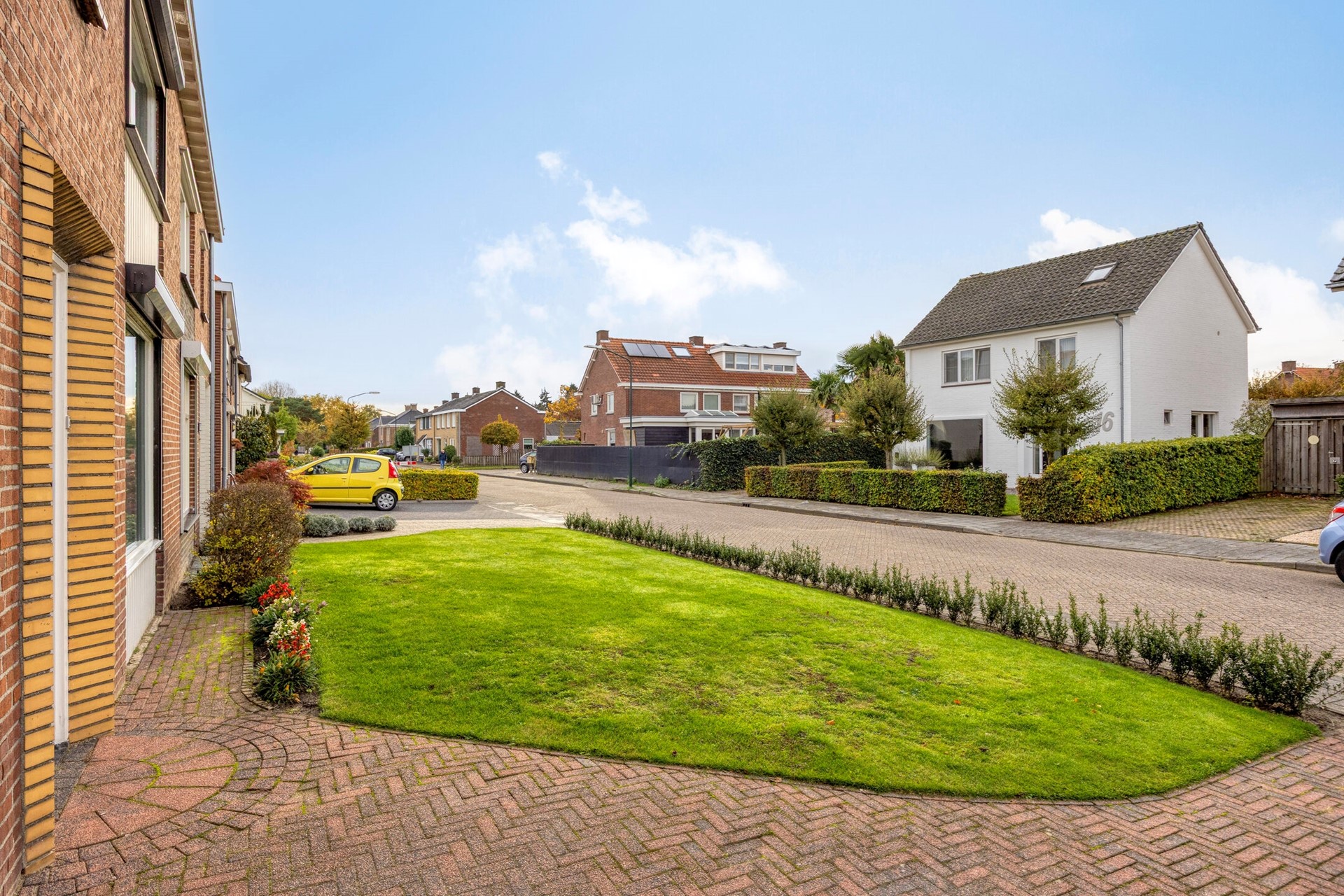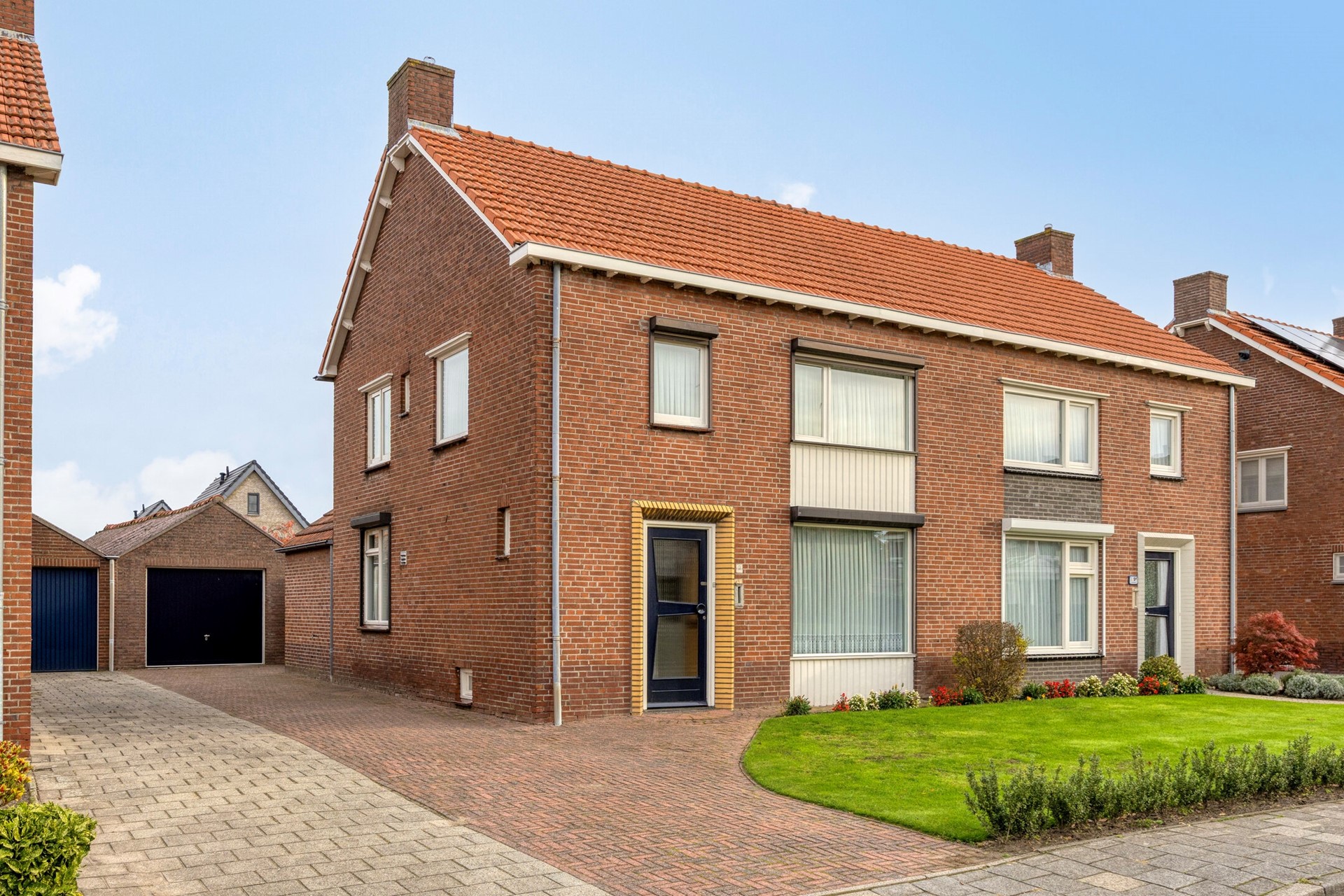 De woning heeft een royale voortuin met gazon en beplanting, en een ruime, beklinkerde oprit die plaats biedt aan meerdere auto’s. Via de poort kom je in de diepe achtertuin: keurig aangelegd met terras, gazon, borders, tuinverlichting en een sfeervol prieel.