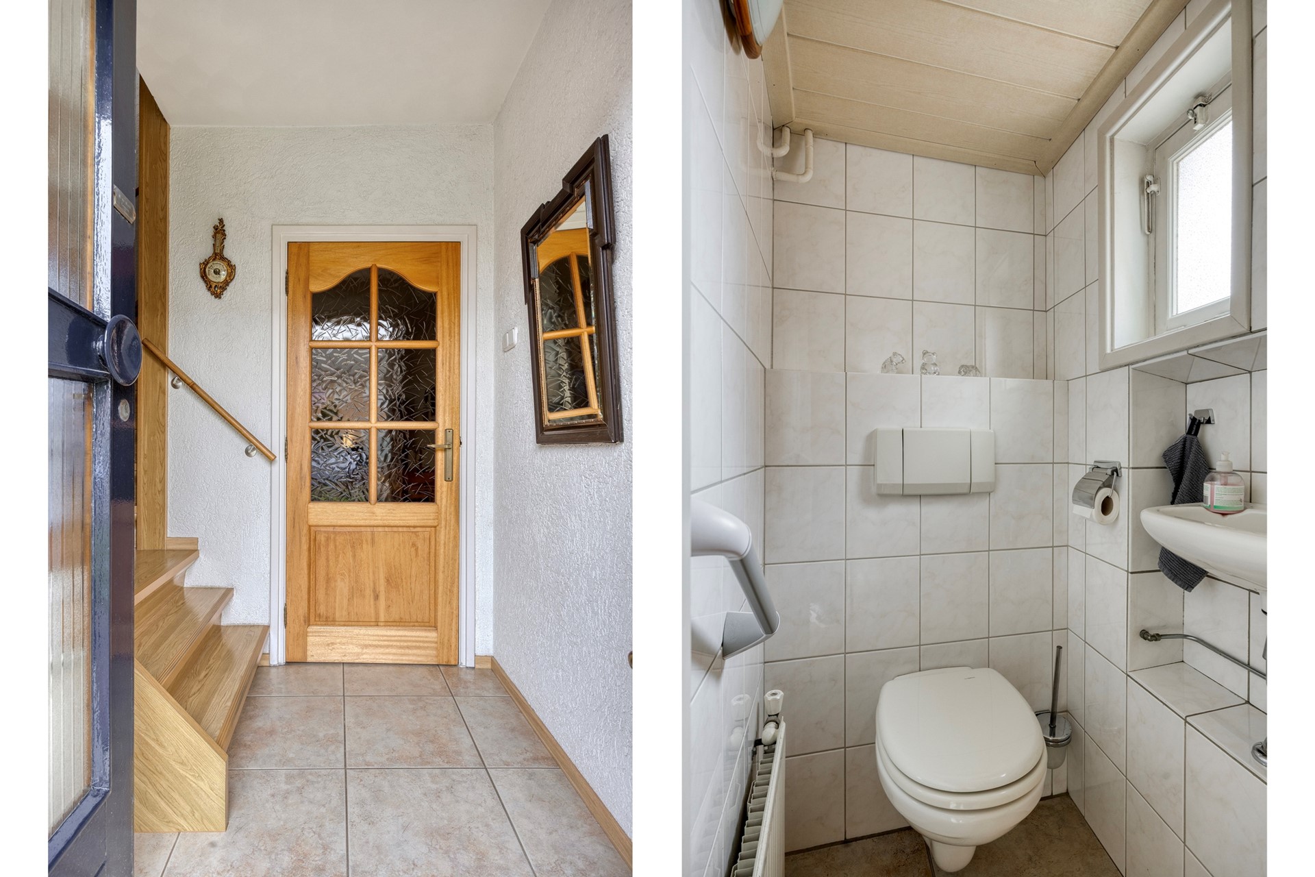 Via de entree aan de voorzijde kom je in de hal met meterkast en het toilet, dat via drie traptreden bereikbaar is en is voorzien van een wandcloset, fonteintje en raam. Vanuit de hal loop je door naar de keuken, die via een toog in verbinding staat met de lichte woonkamer. Dankzij de raampartijen aan voor- en achterzijde geniet je hier van een prettige, open sfeer.