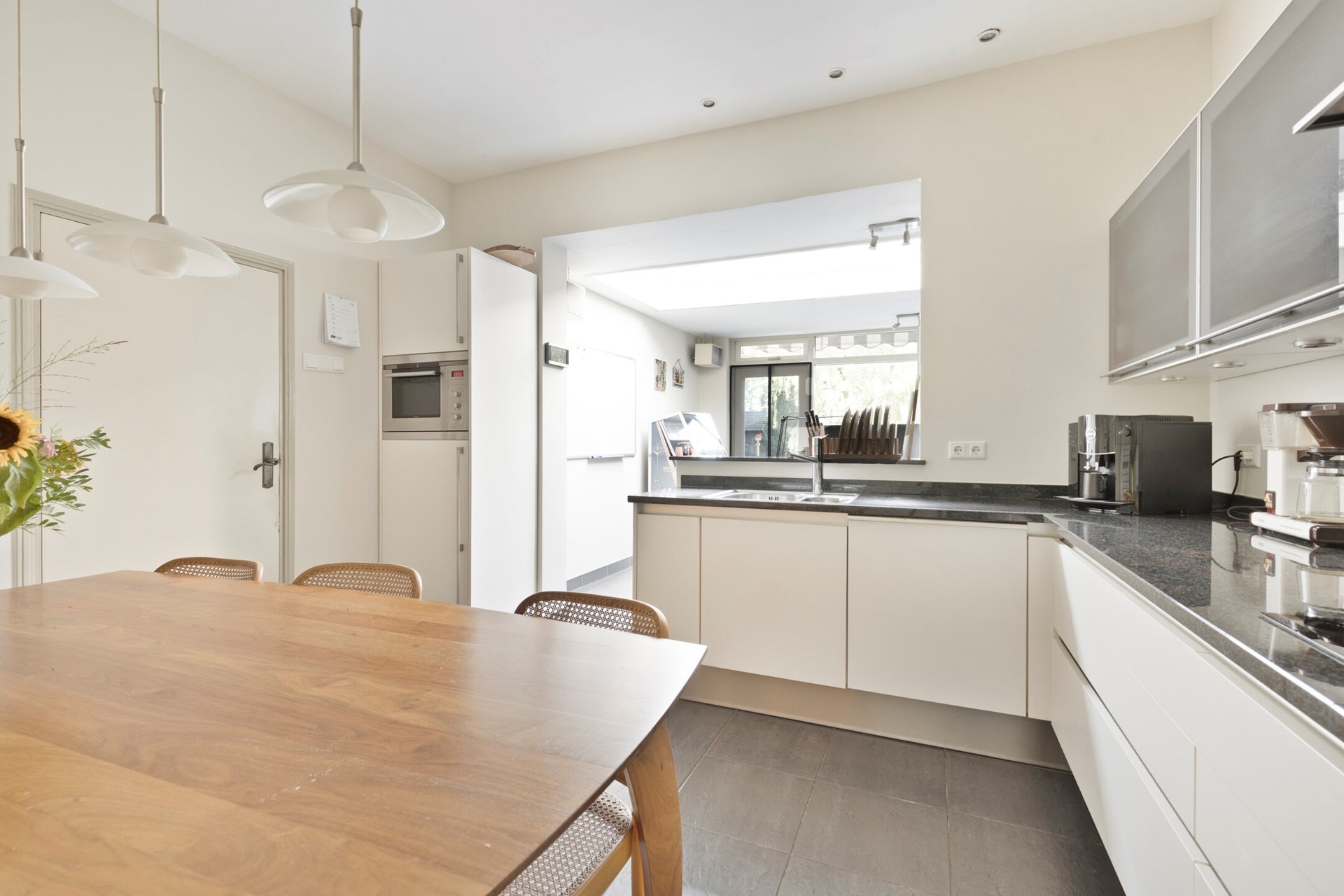De royale eetkeuken is uitgevoerd in een moderne hoekopstelling met greeploze witte fronten en een granieten werkblad. De keuken is voorzien van een inductiekookplaat, wokbrander, afzuigkap, vaatwasser, combi-magnetron en koelkast. Dankzij de tegelvloer met vloerverwarming is het hier behaaglijk koken en tafelen.