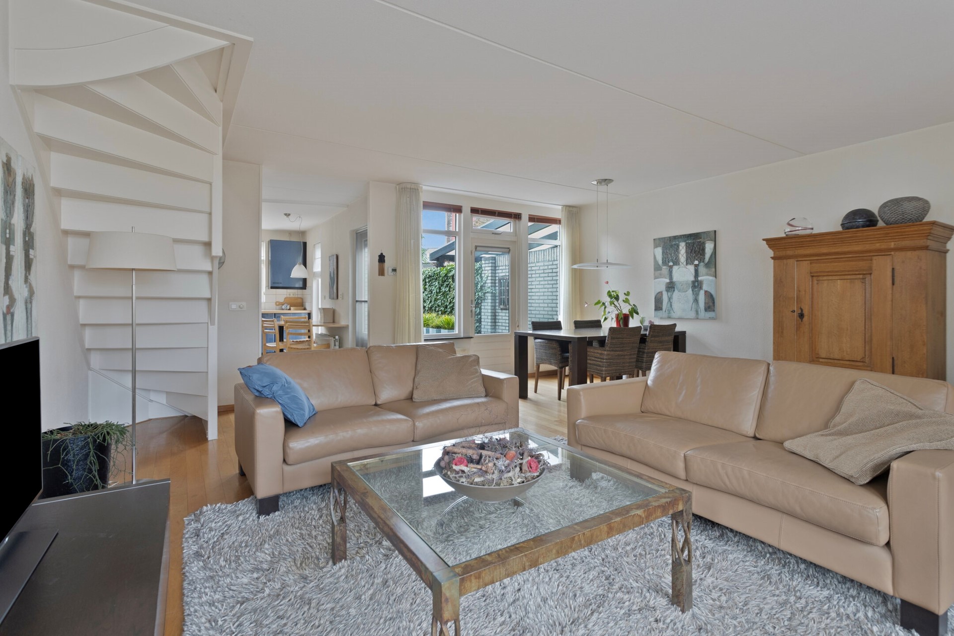 De ruime woonkamer (ca. 36 m²) is afgewerkt met een eikenhouten vloer, lichte wanden met spachtelputz en een spuitwerk plafond. Vanuit de woonkamer is er toegang tot het terras en de trapopgang naar de eerste verdieping.