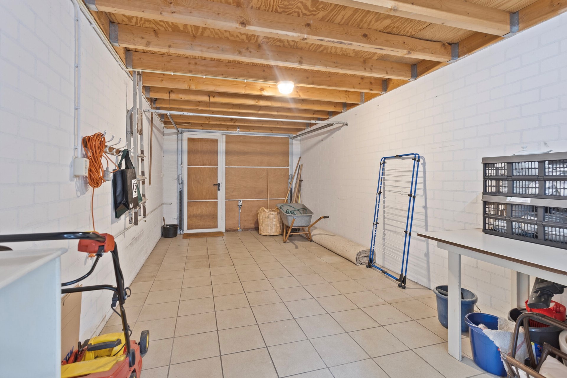 Aansluitend bevindt zich de bijkeuken, uitgerust met een extra keukenopstelling, de aansluitingen voor wasmachine en droger en een deur naar de tuin. Vanuit de bijkeuken is de garage binnendoor bereikbaar.