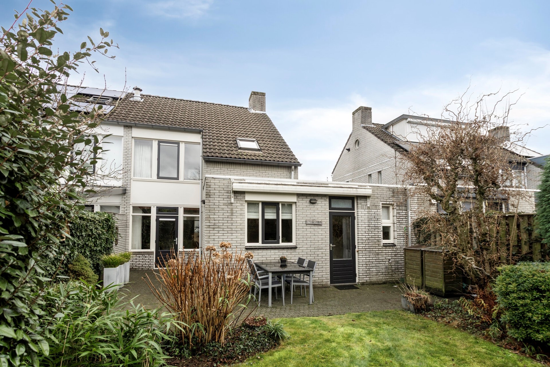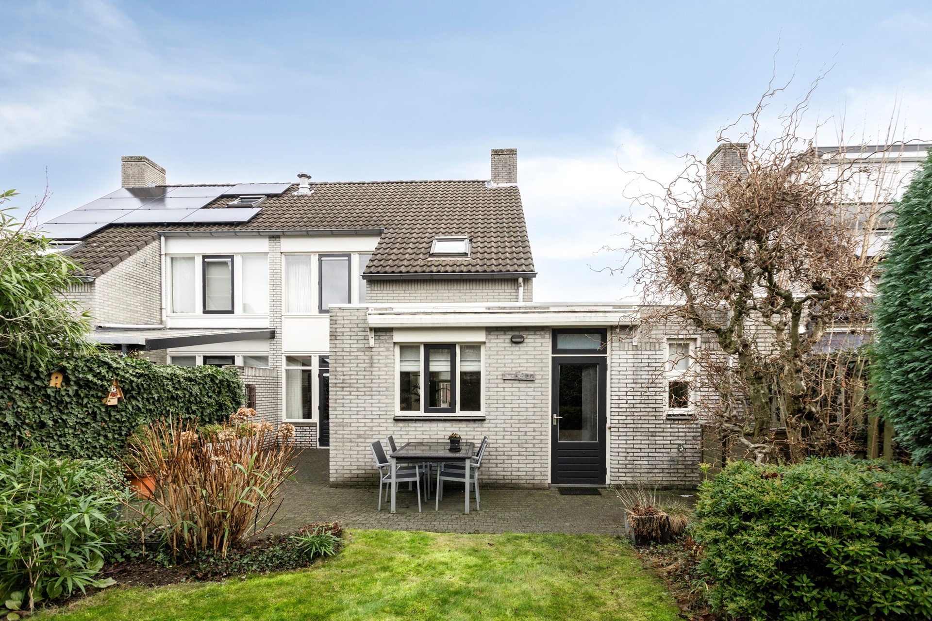 De verzorgd aangelegde achtertuin beschikt over een royaal terras, gazon en diverse beplanting. Tegen de achtergevel is een elektrisch bedienbare zonneluifel geplaatst, waardoor je ook op warme dagen comfortabel buiten kunt zitten.