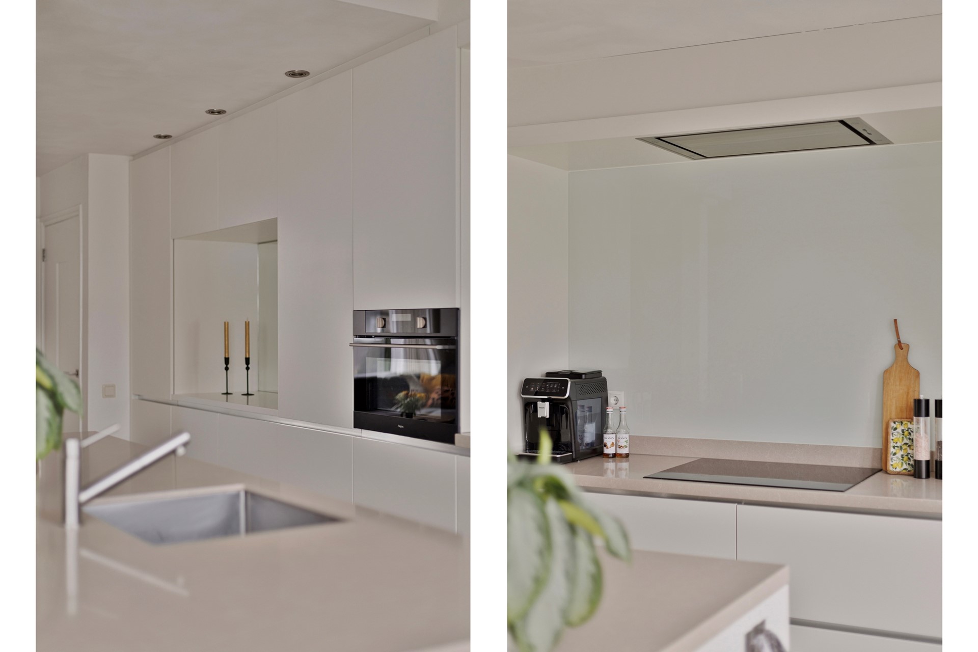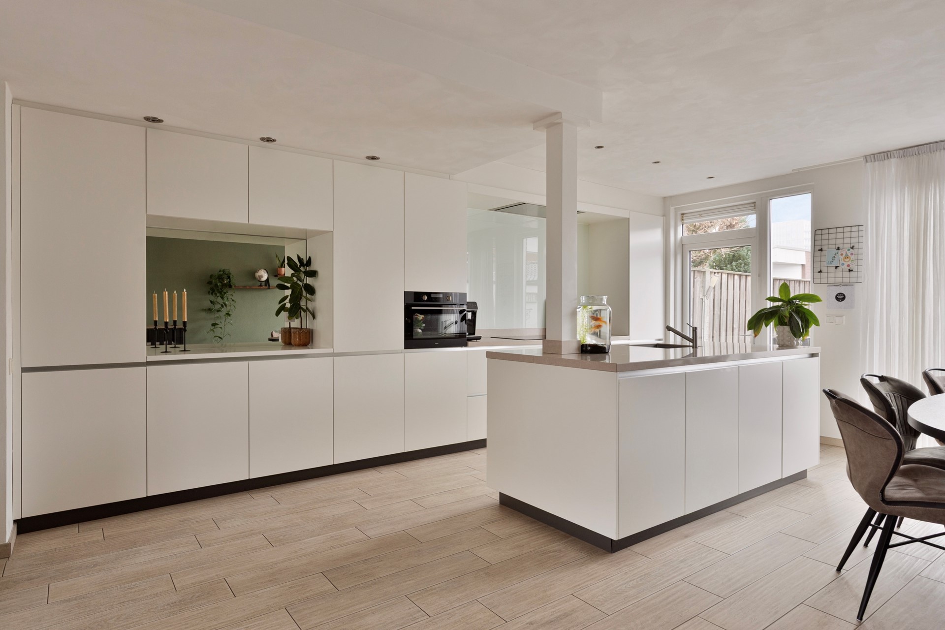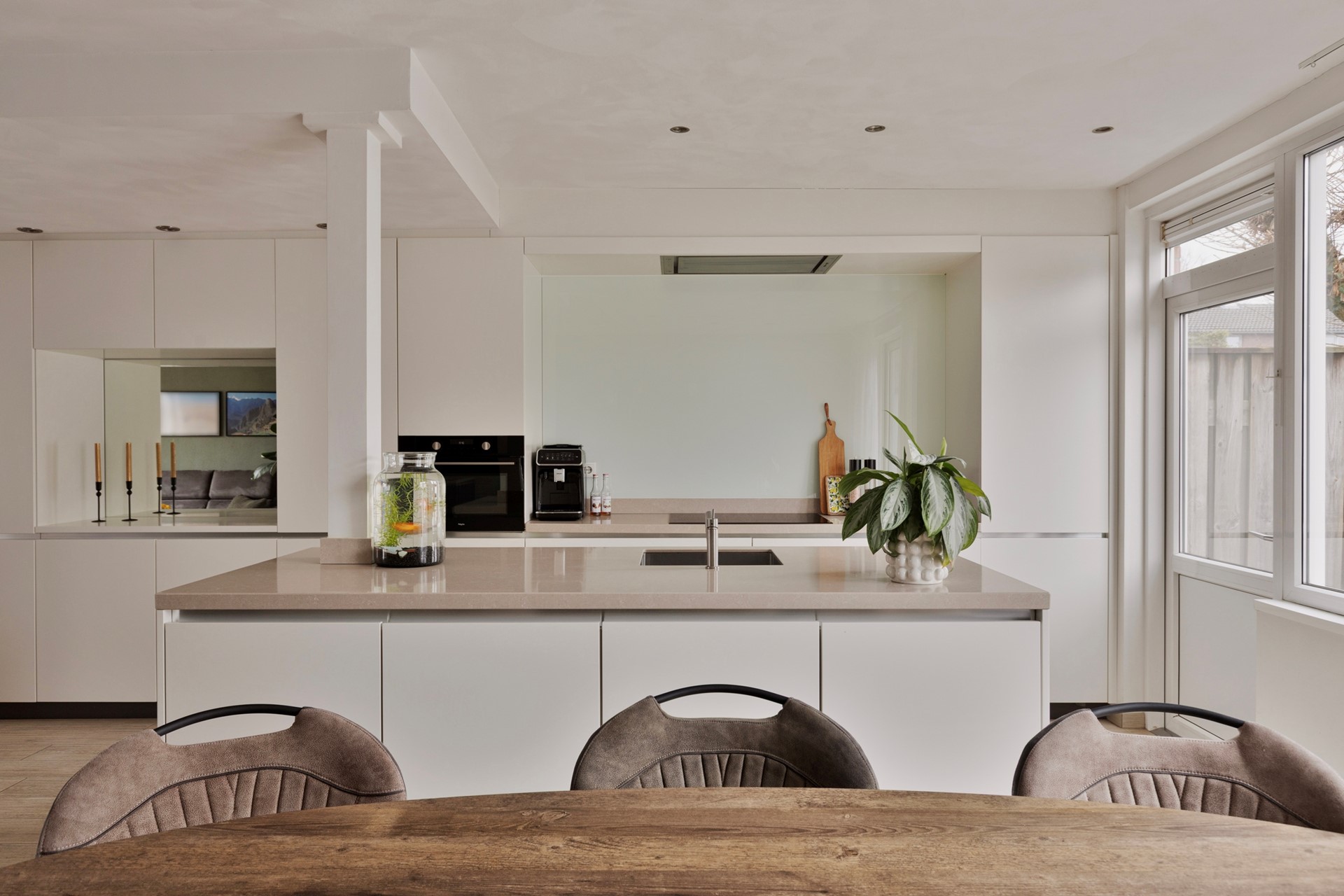 De luxe moderne keuken is gesitueerd in de uitbouw en uitgevoerd in een lichte kleurstelling. De keuken beschikt over een grote kastenwand met volop bergruimte en diverse inbouwapparatuur, waaronder een inductiekookplaat met afstandsbediening (Novy), koelkast, vriezer en combi-magnetron/-oven. Het spoeleiland is voorzien van een RVS spoelbak, vaatwasser, close-in boiler en extra bergruimte. Het composiet werkblad, de inbouwverlichting en glazen achterwand geven de keuken een hoogwaardige uitstraling. Via de schuifpui met grote glaspartij is er direct toegang tot de achtertuin.