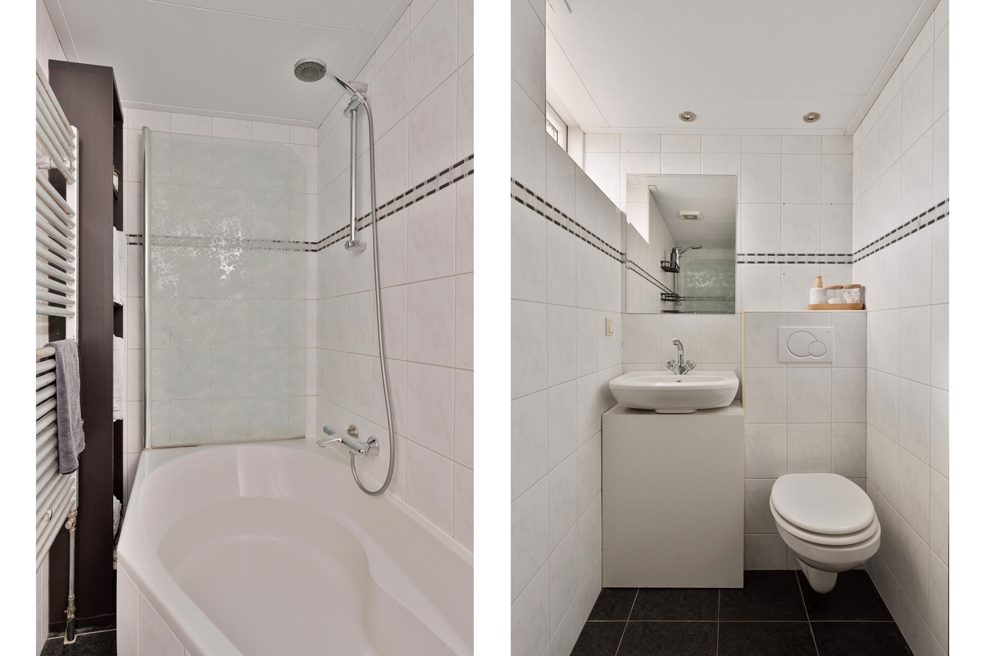 Via de overloop zijn drie slaapkamers bereikbaar, allen voorzien van horren en rolluiken. De volledig betegelde badkamer is uitgerust met een ligbad, douchewand, vaste wastafel, wandcloset, designradiator en een raampje voor natuurlijke ventilatie.