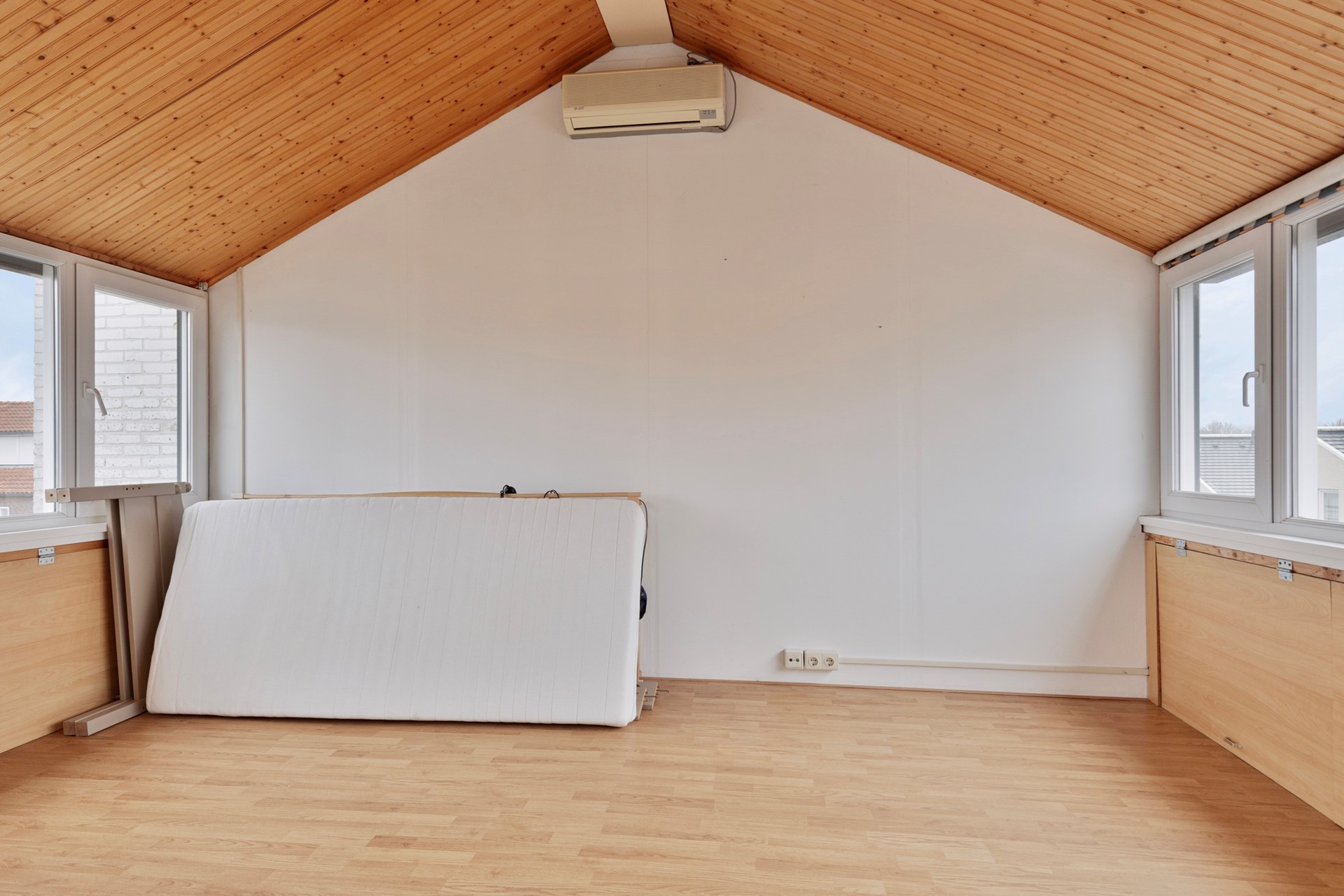 Accessible via a fixed staircase, the second floor consists of a landing area with the central heating boiler (Vaillant, built in 2008), connections for washing equipment, and access to attic storage. From here, the fourth bedroom can be reached, featuring a large dormer window, air conditioning, and additional storage space behind the knee walls.